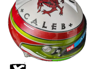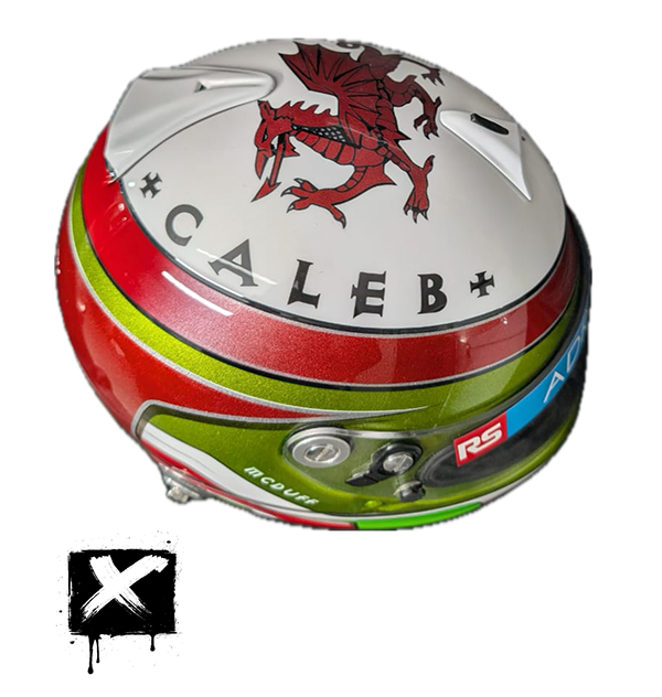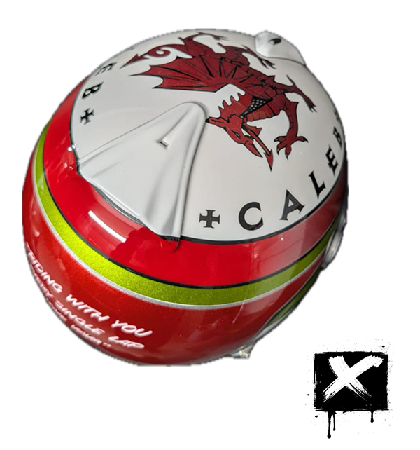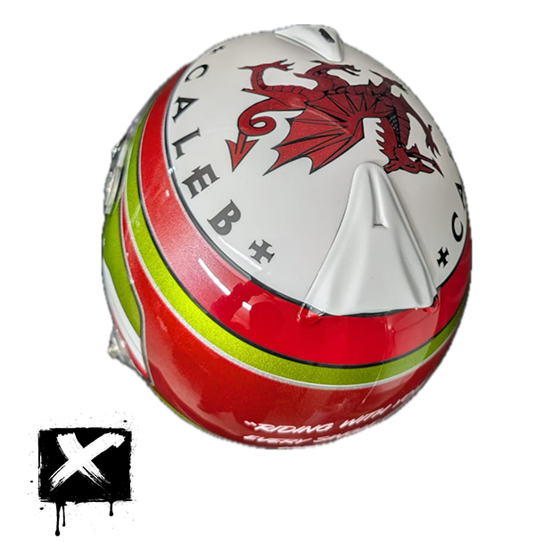 Caleb’s original helmet was already iconic — it had roots in his Welsh identity — and this one had to take that concept and amplify it. Deep reds. Bold forms. Wales. Dragons. Identity. Not just decoration, but a graphic language that reads at speed and broadcasts personality even before he turns a wheel.