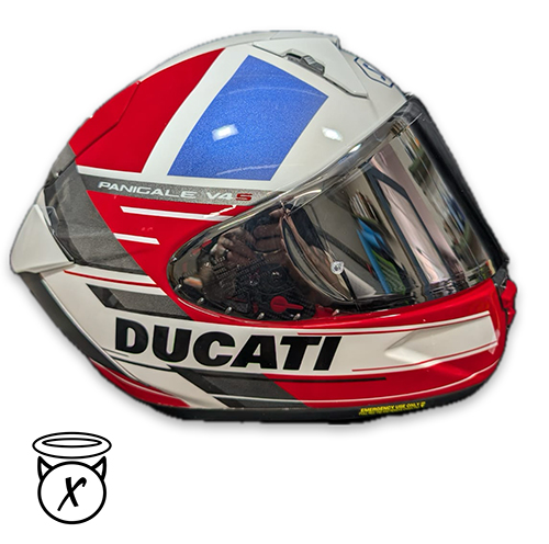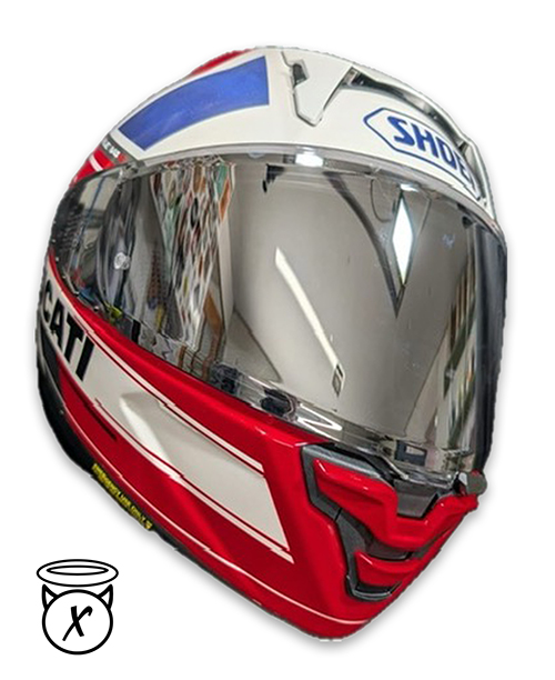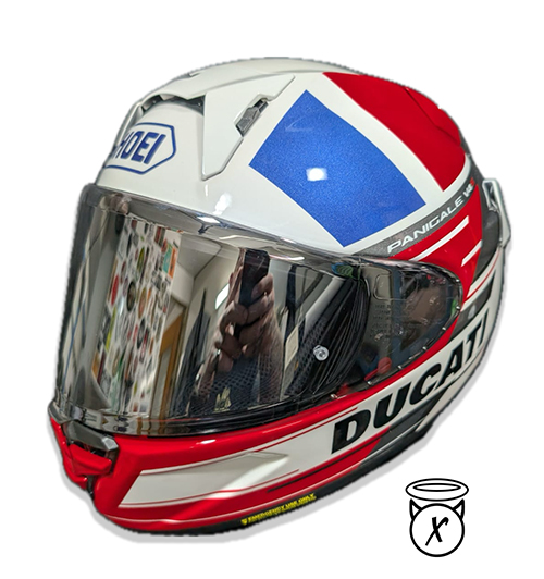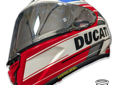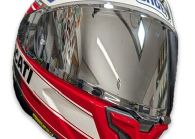 This design is a tip of the hat to the Moto GP team and livery, it also matched a V4 panigale quite well. I am a huge fan of the Shoei SPR-X Pro. The same helmet as worn by Marc Marquez and it is available through our online shop.