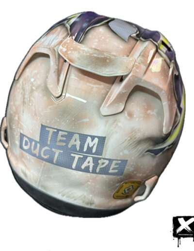 pictured is a custom painted bell 500 helmet sat on top of a ccm spitfire tank